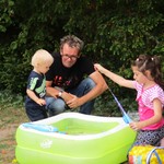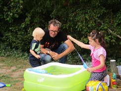 Seifenblasen in jeglicher Form und Größe flogen überall durch die Luft und es war toll zu sehen, wie die Kinder versuchten und es schließlich schafften, aus den Pusteteilen oder mit den Fäden kleine und große Seifenblasen fliegen zu lassen und hinter ihnen herzurennen und sie zu zerplatzen! In 2 Bällebädern konnte gebadet werden und die Wasserratten konnten im Wasser Enten angeln und Eiswürfel keschern.